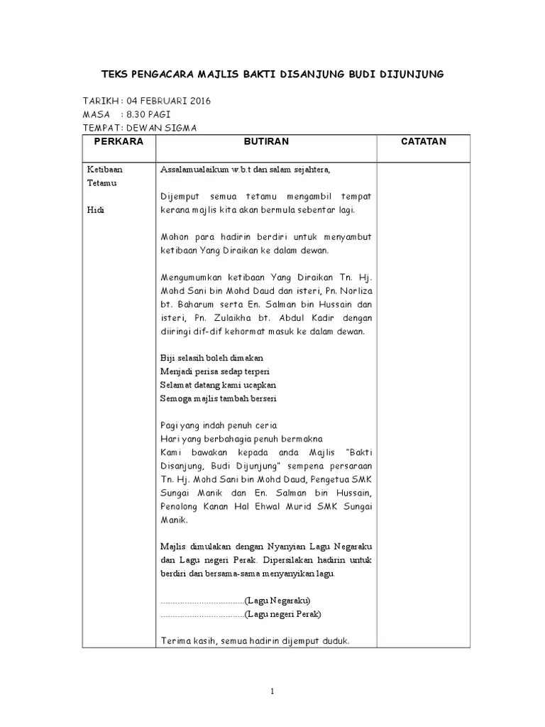 Ali 1.ketibaan yang dirai dan tetamu mengumumkan ketibaan yang diraikan en. Teks pengacara majlis persaraan teks pengacara majlis "kasih disemai bakti dituai" sempena persaraan tuan hj mawardi pagi yang indah penuh ceria. Hari yang indah penuh ceria hari yang berbahagia penuh bermakna bismillahirrahmanirrahim assalamu `alaikum w.b.t. . Majlis dengan segala hormat mempersilakan. Teks pengacara majlis gb bersara.